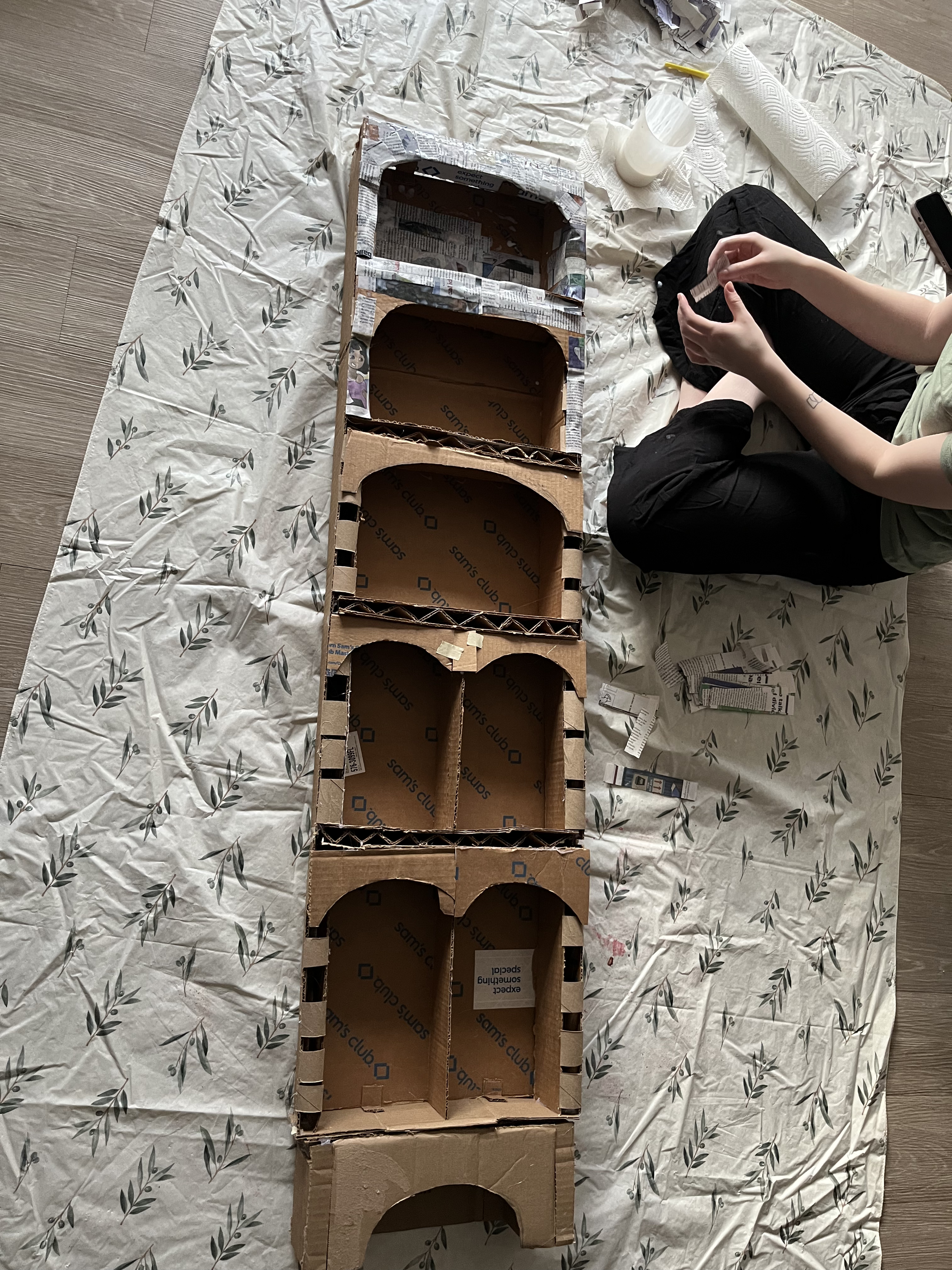 Branching out from my typical medium of acrylic paint on maple wood or canvas board, I used scrap cardboard and newspaper to construct a study shelf. It is currently waiting to be painted with a variety of subtle floral motifs.